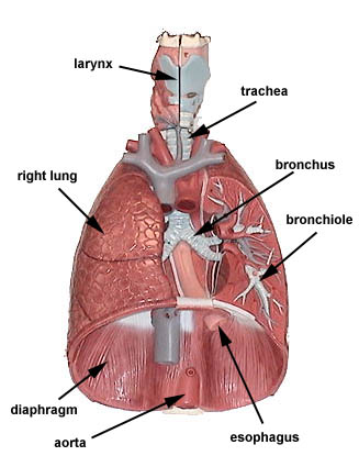 From the pharynx, air moves past the epiglottis and in the trachea. Connecting these two tubes is a short passageway called the larynx or voice box. Here, membrane folds are stretched across the passageway. As air moves past these folds, the folds vibrate. By controlling how tightly stretched the folds are, and by how open the passageway is, we are able to produce sounds. As these sounds resonate within the pharynx, nasal and oral cavities and modified by the muscles of the face, tongue and lips, we are able to make recognizable speech. The trachea is a tube about 4 to 5 inches in length and about one inch in diameter. Rings of cartilage support this passageway keeping it open for unobstructed airflow. The epithelium of the trachea is composed of pseudostratified columnar epithelial cells. The exposed surface of these cells are ciliated. Small dust particles that have penetrated this far can be trapped by this epithelium. The cilia move these particles up the trachea and into the pharynx where they are then swallowed. At the inferior end of the trachea, the tube splits into left and right branches. These are the bronchi. The bronchial tubes are also held open by cartilage rings. |
